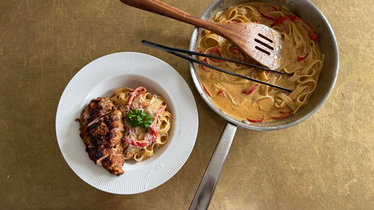 Efter at have stegt kyllingen og kogt pastaen al dente, samles retten i en silkeblød sauce lavet med madlavningsfløde og parmesan. En god stegepande sikrer, at saucen reducerer jævnt uden at brænde på – noget, der er essentielt for at få den perfekte konsistens.