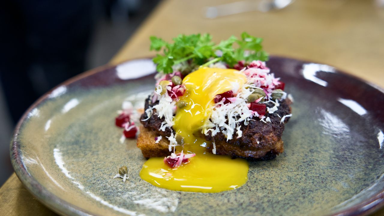 - Top bøffen med de hakket løg, rødbeder, kapers, peber, sennep, æggeblomme og frisk persille