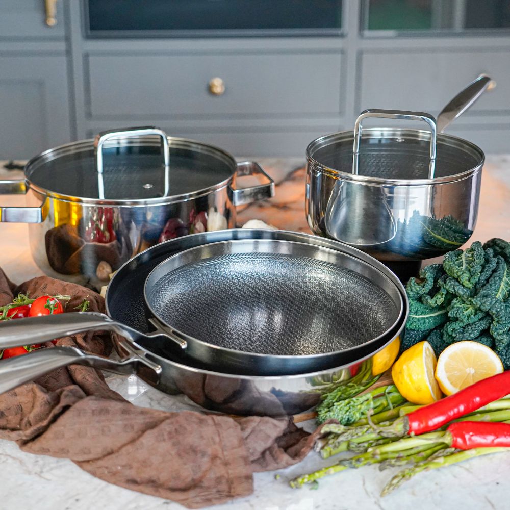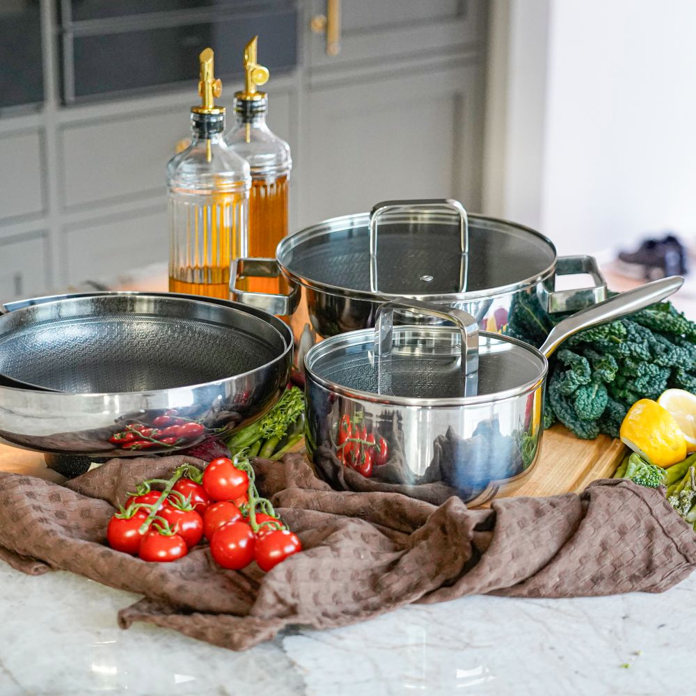 Dette sæt dækker både små og store opgaver i køkkenet og er skabt til alle varmekilder – også induktion og ovn op til 250 °C.
