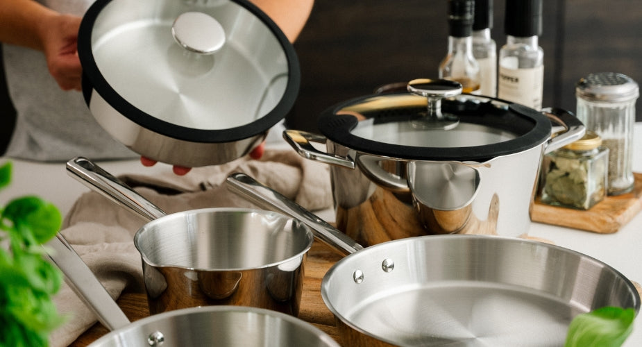 Rustfrit stål i en 3-lags konstruktion. Låget er lavet i glas med anti-heat silikone på siderne.