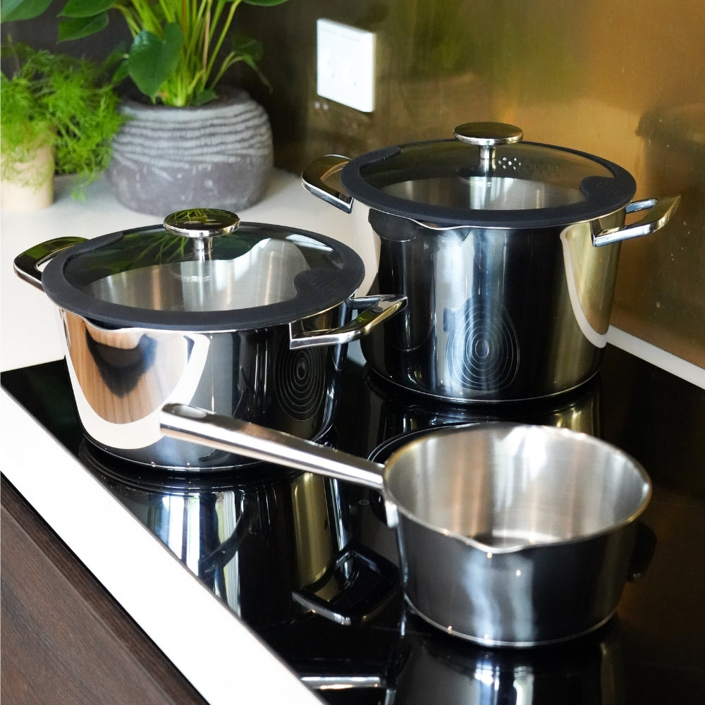Sættet er kompatibelt med induktion, gas, keramisk og elektrisk komfur – og tåler desuden ovn op til 200 °C. Du kan let flytte gryderne fra komfur til ovn, fx til langtidsstegning eller gratinering.