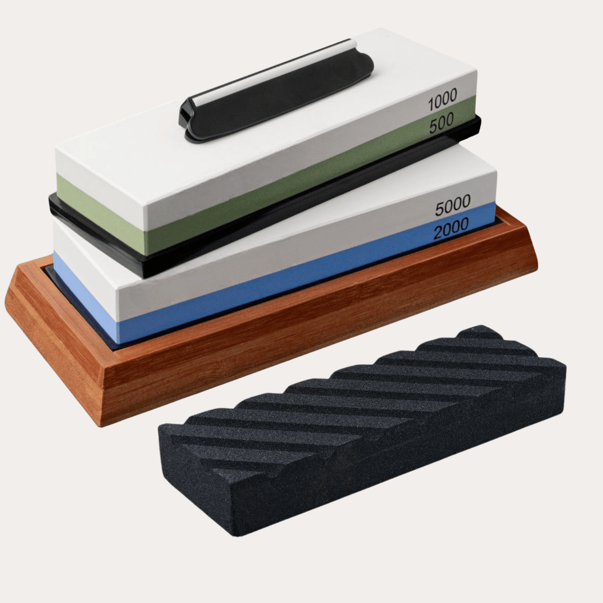 Vores slibestenssæt er din nøgle til at opretholde knivskarpheden derhjemme. Med 4 forskellige kornstørrelser tilbyder sættet alsidig slibning, der kan rette beskadigede knivblade og polere dem til perfektion.