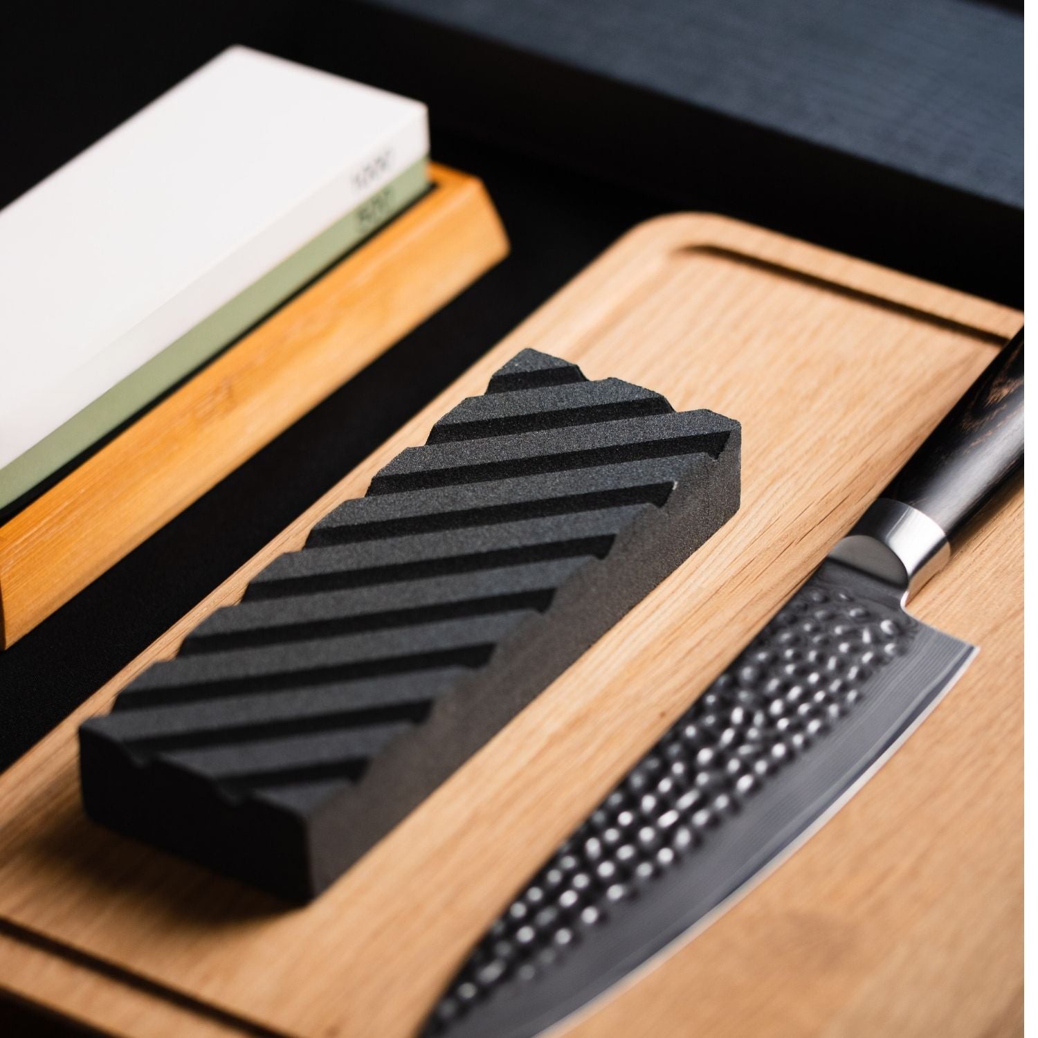 Det ergonomiske design sikrer enkel brug, mens den skridsikre base holder stenen stabil under slibningen. Vores sæt er fremstillet af materialer af høj kvalitet for at sikre langvarig ydeevne og knivskarphed.