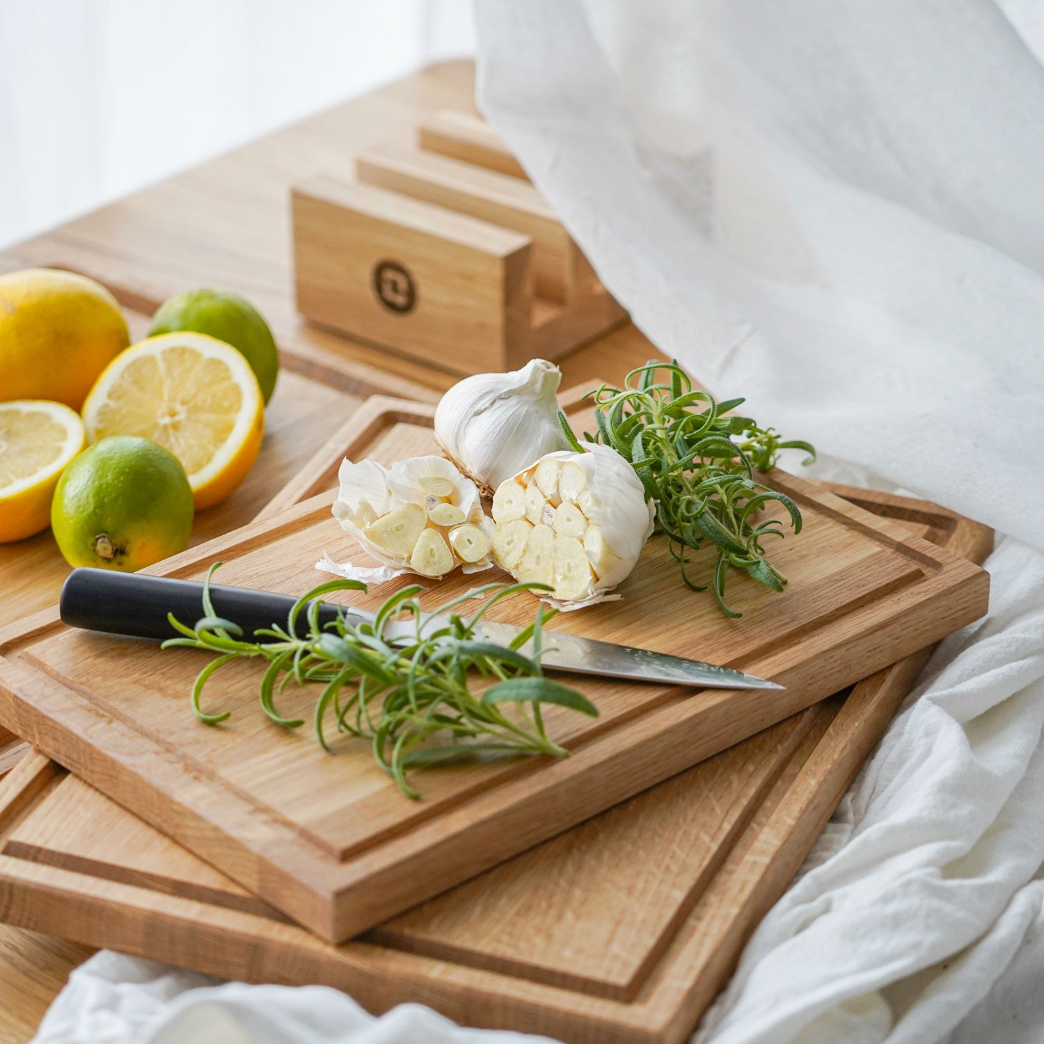 Vores serie af skærebrætter i FSC-certificeret egetræ er skabt til dig, der ønsker funktionelle og æstetiske redskaber i dit køkken – og den fulde oplevelse får du med hele sættet.