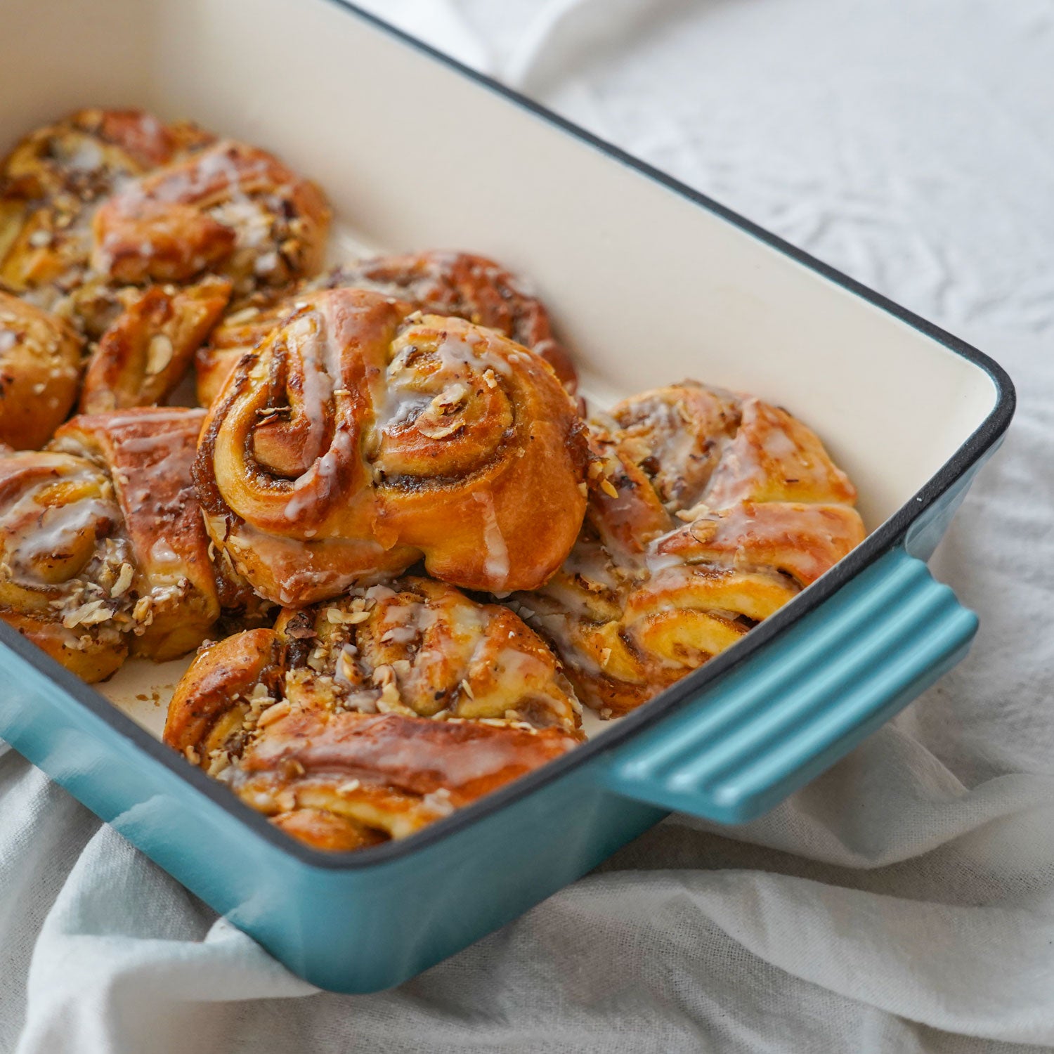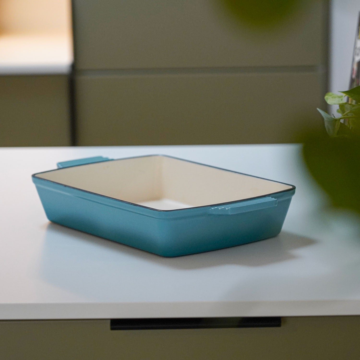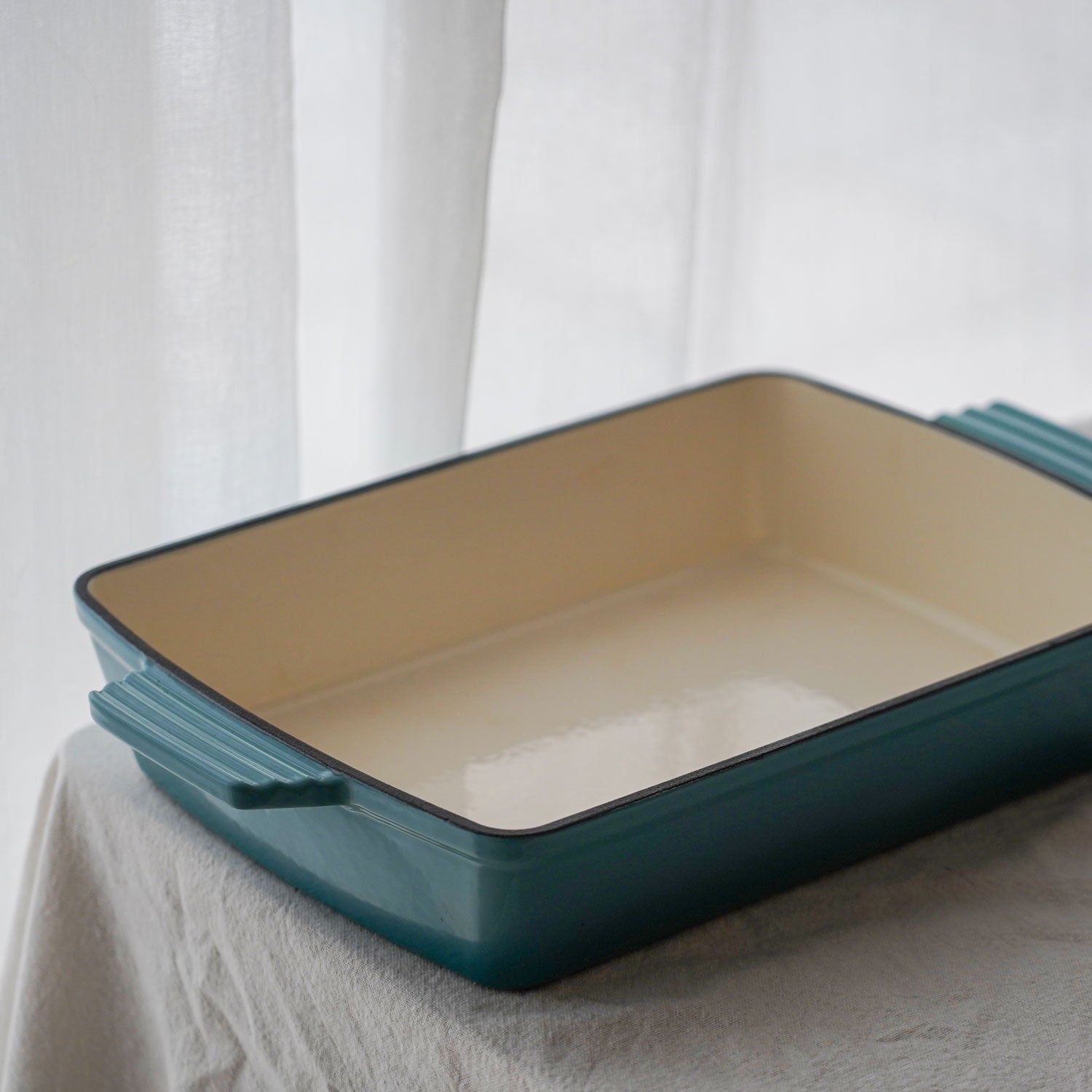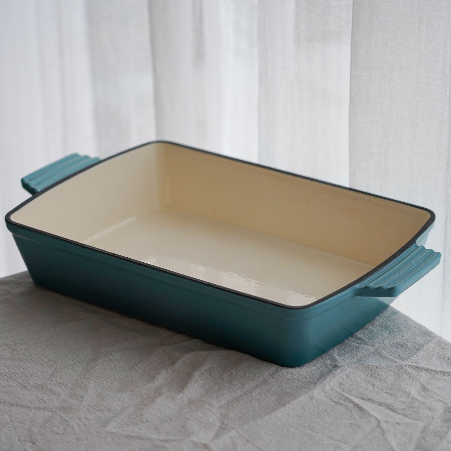 Med vores emaljerede fad i støbejern får du en ægte allrounder til både hverdag og gæstemiddag. Det lange fad og den store flade gør det perfekt til ovnretter som lasagne, kylling, bagte grøntsager eller gratin. Og med sin elegante Arctic Blue-finish er det lige så velegnet til servering som til tilberedning.