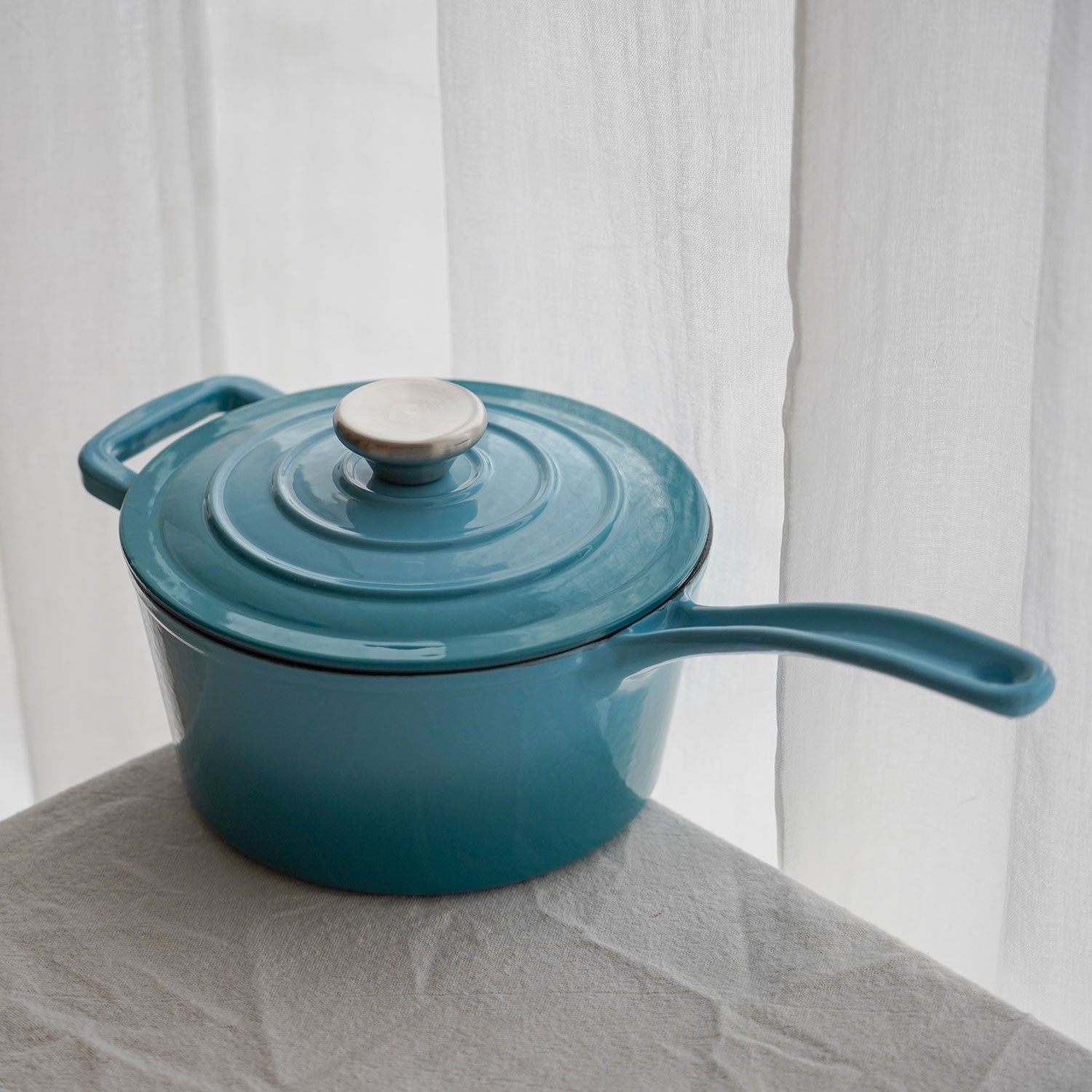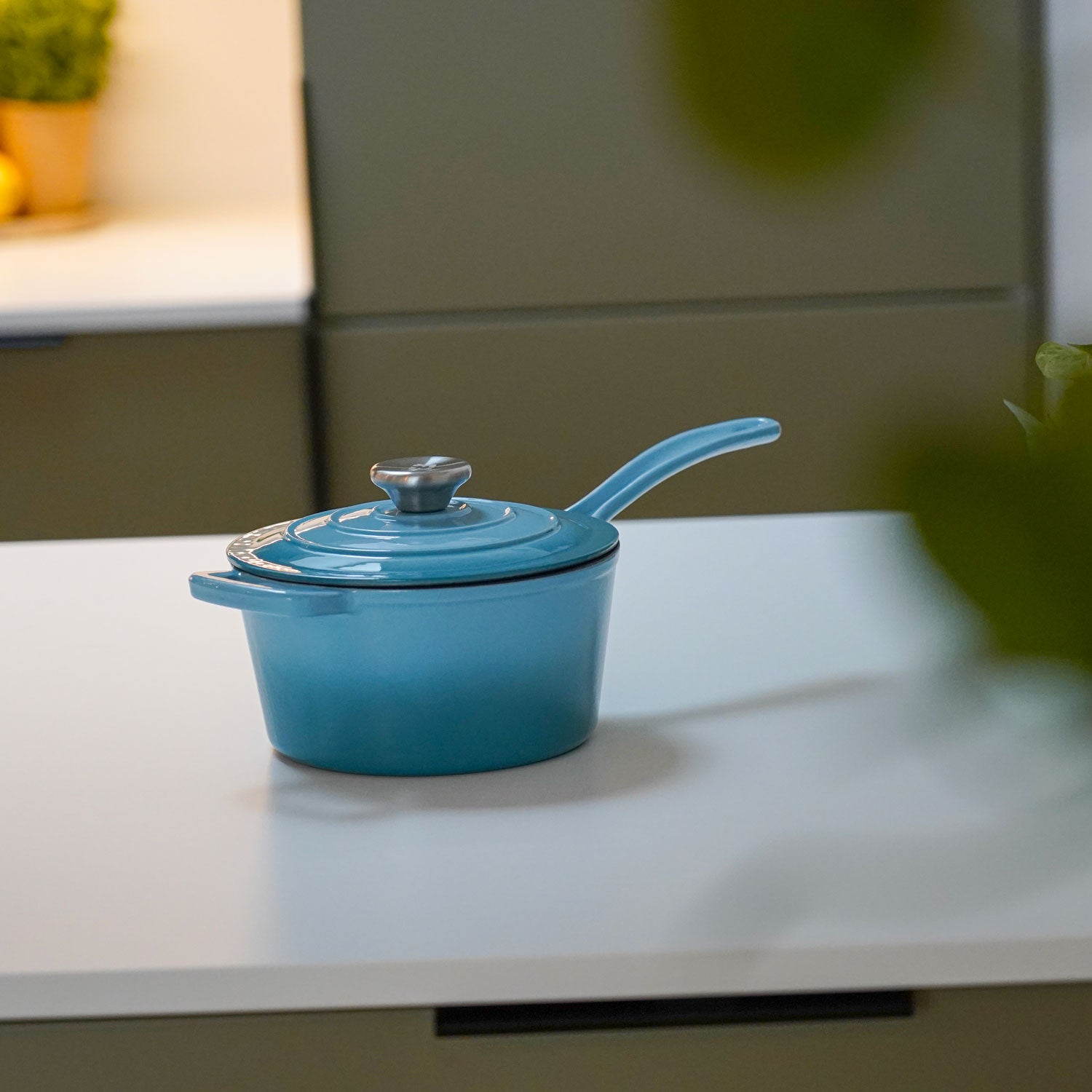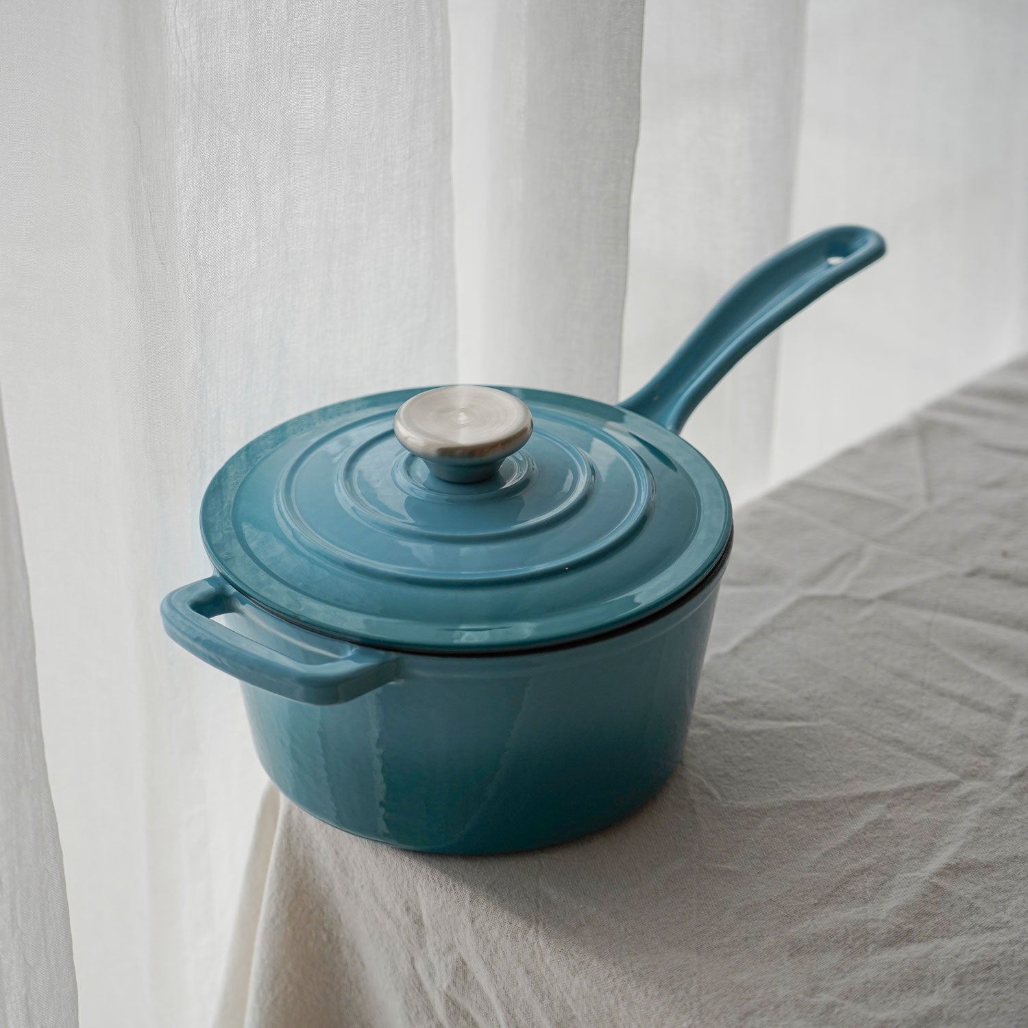 Vores emaljerede kasserolle i støbejern på 2 liter er den perfekte hjælper til de små opgaver i køkkenet. Brug den til at koge æg, lave sovs, varme rester eller tilberede grøntsager med masser af smag. Med det elegante Arctic Blue-design er den både funktionel og smuk – og lige til at sætte på bordet.